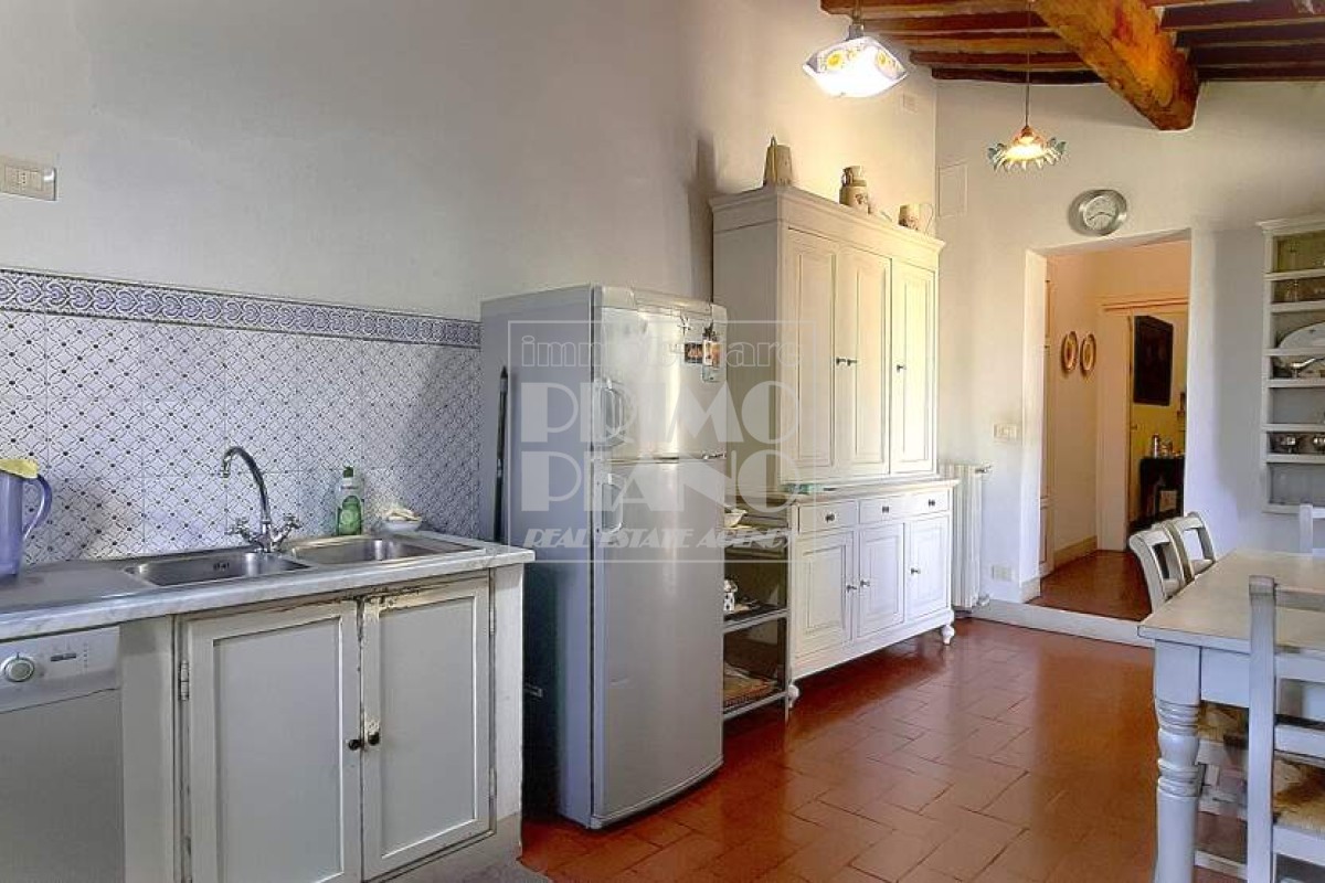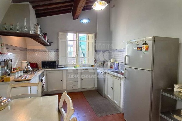 The apartment comprises: spacious entrance hall, hallway, dining room, fully equipped eat-in kitchen, large living area with fireplace and two south-facing windows overlooking Guinigi Tower, guest bathroom, three generously sized bedrooms, additional bathroom, walk-in closet and balcony.