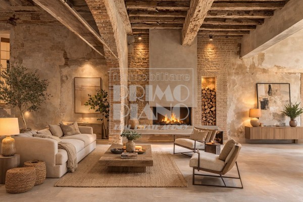 Ampia zona living open-space con soffitti affrescati, pareti in pietra, volte in mattoni e travi in legno a vista
