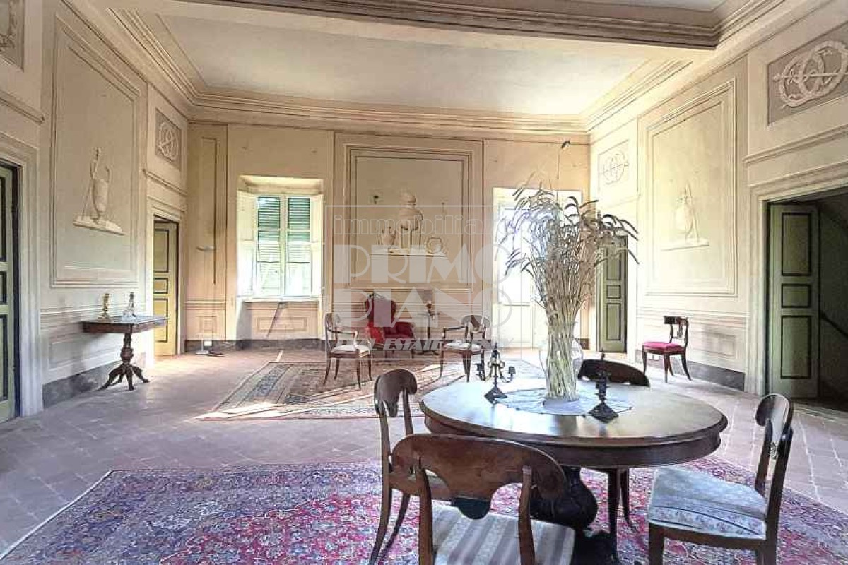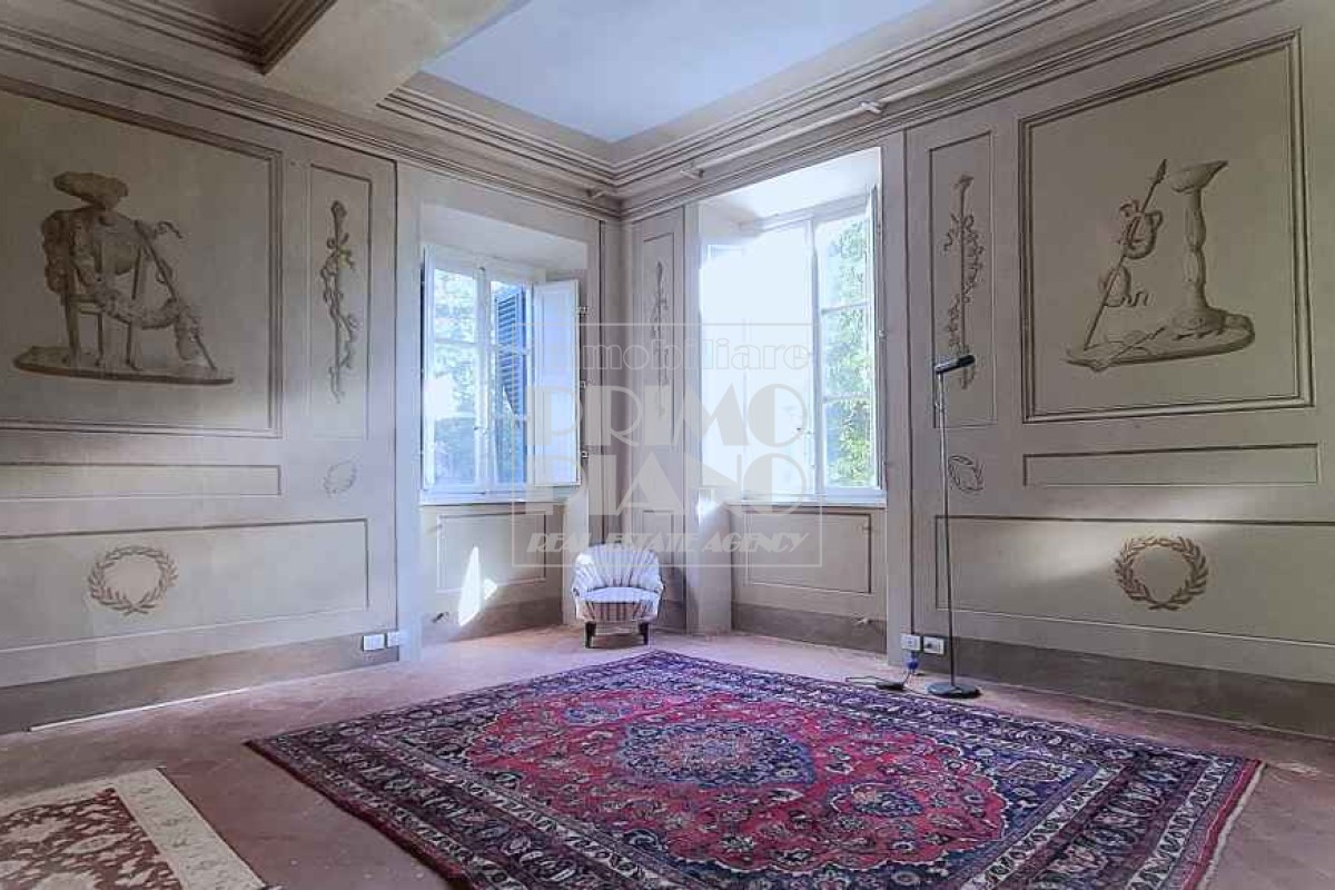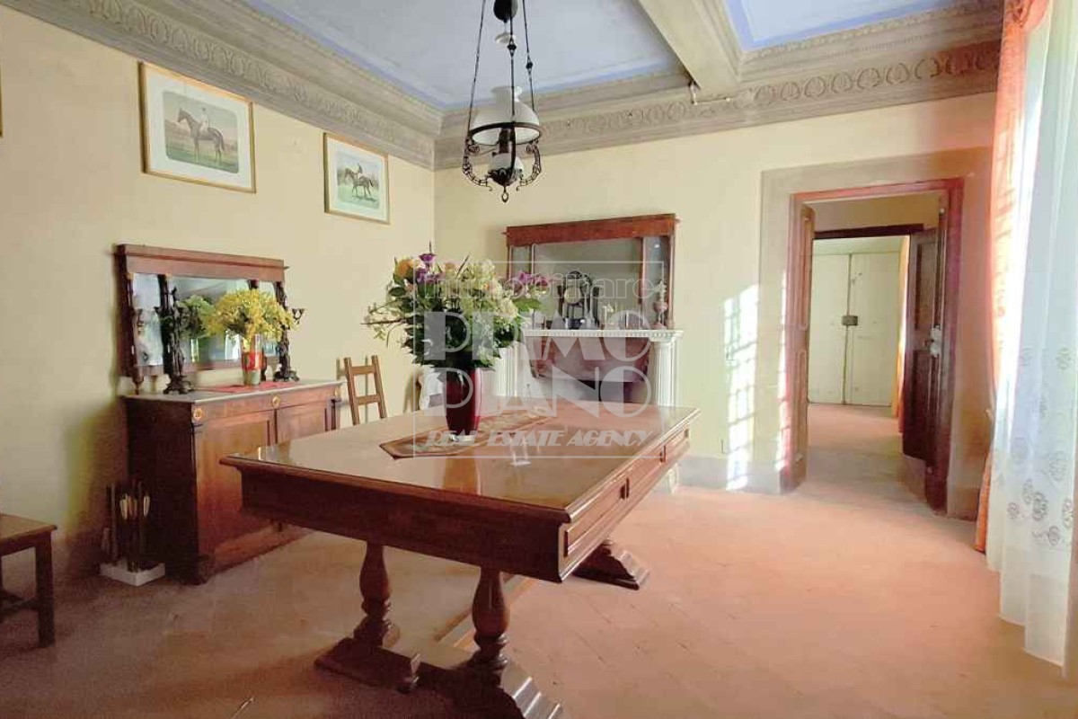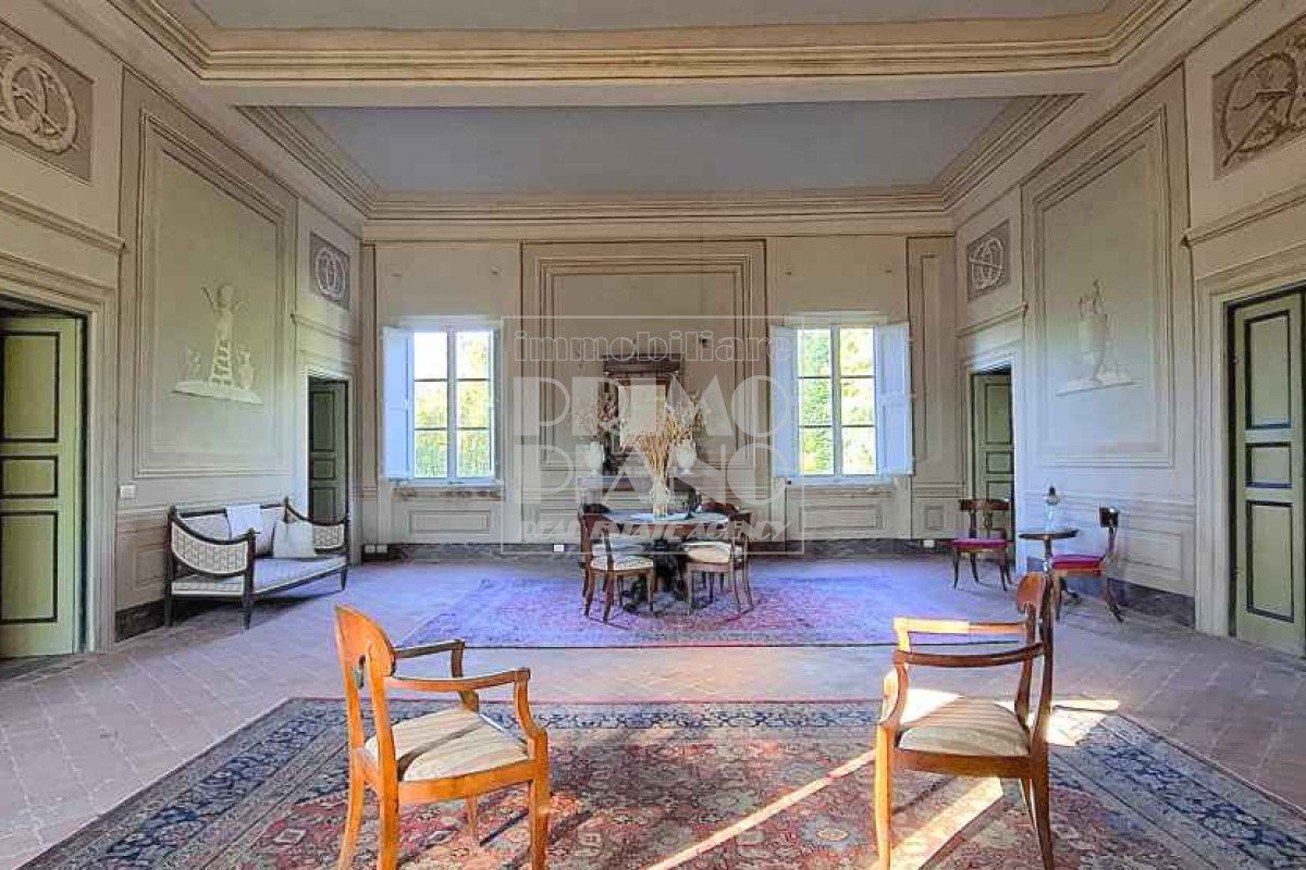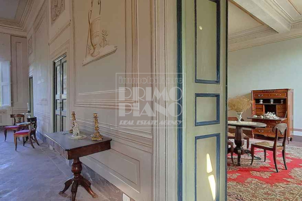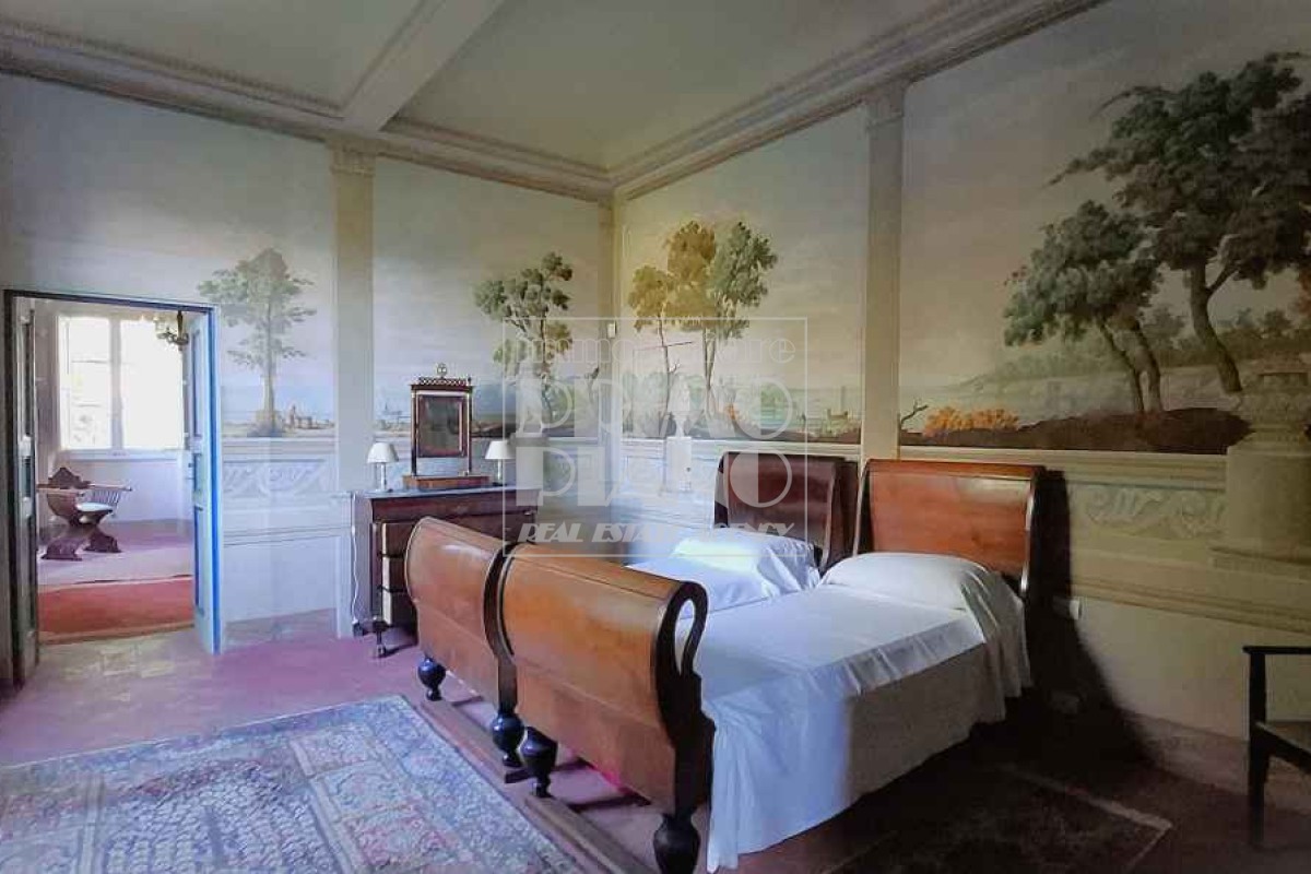 Il primo piano ospita un maestoso salone di rappresentanza, una suite padronale con salotto, camera e bagno, oltre a ulteriori camere matrimoniali, studi e bagni. Nella parte ovest, un ampliamento ottocentesco accoglie un’elegante suite con bagno privato e ambienti di servizio.